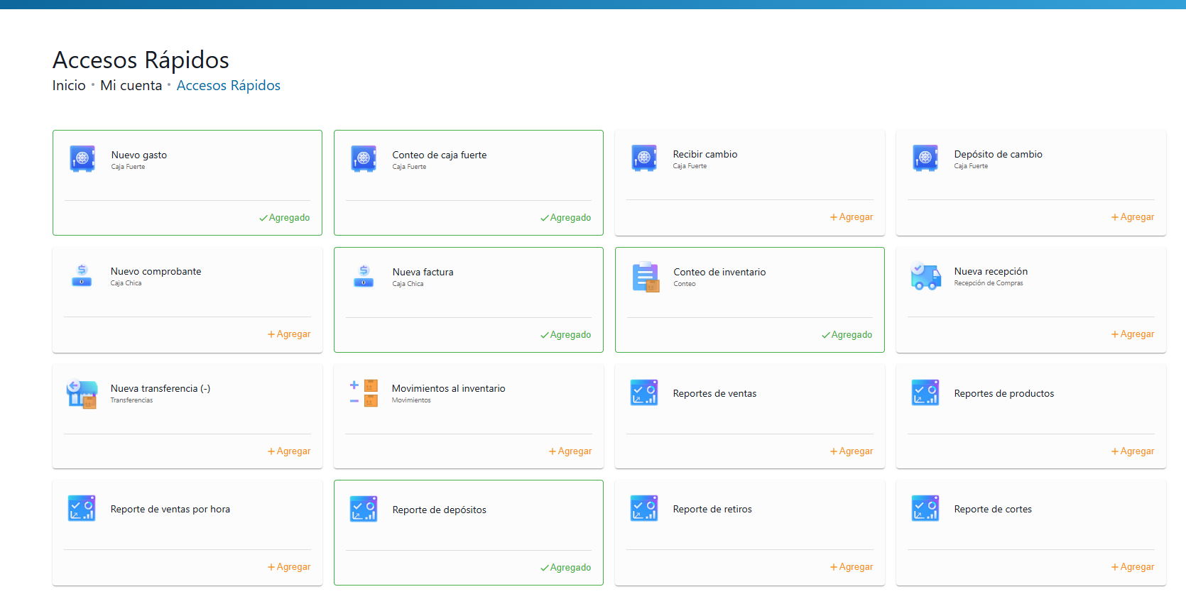 La sección de acceso rápido permite al usuario personalizar las funcionalidades o acciones del sistema que se utilizan con mayor frecuencia durante su operación diaria.