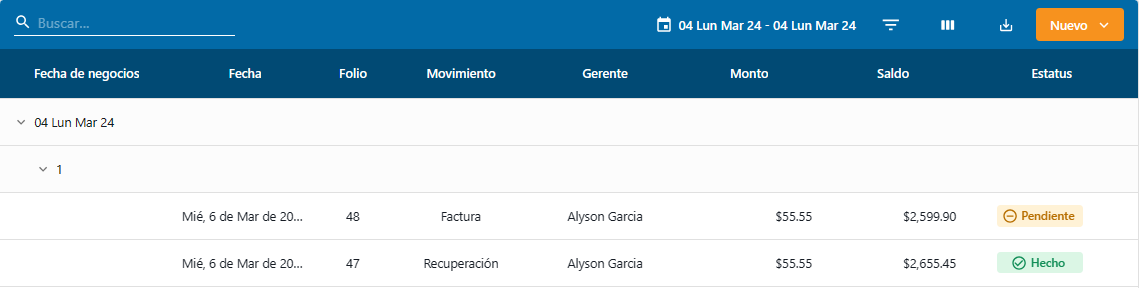 - Estatus: Muestra el status o estado del movimiento.