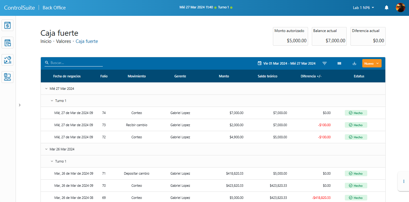 - Saldo Teórico: Es el monto total de la caja fuerte calculado según los movimientos realizados.