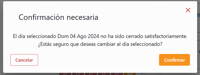“El día seleccionado no se ha cerrado satisfactoriamente. ¿Estás seguro de que deseas cambiar al día seleccionado?”