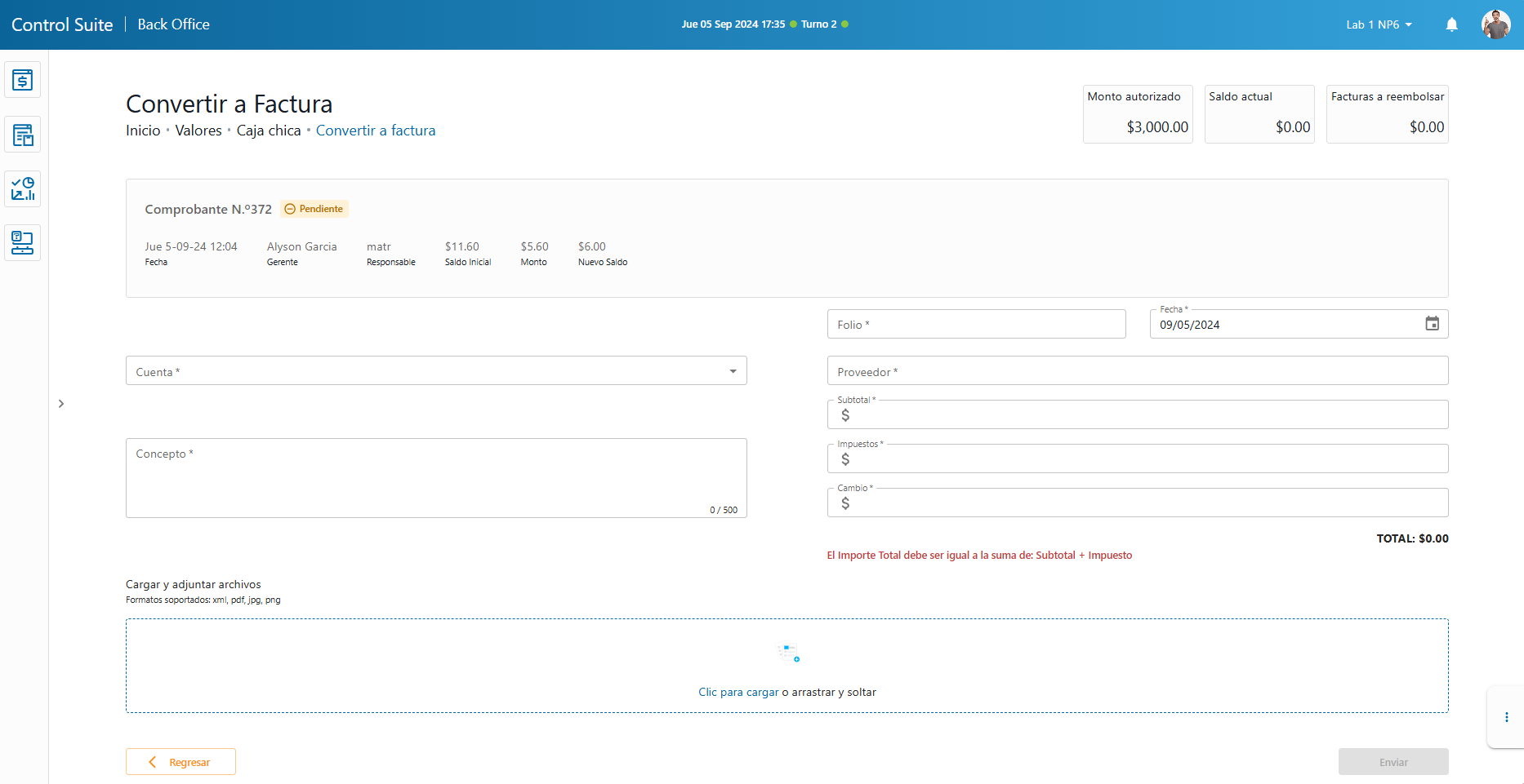 - Desde la pantalla principal de Caja Chica, ve a la tabla de movimientos y selecciona un movimiento de tipo Comprobante.
