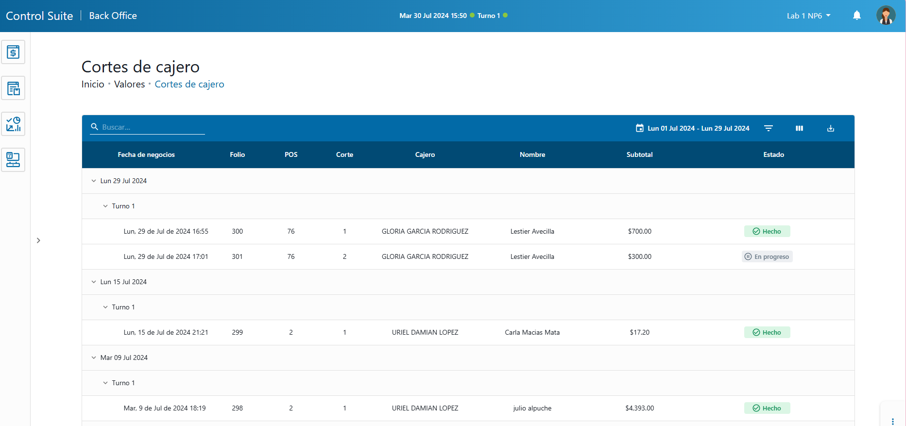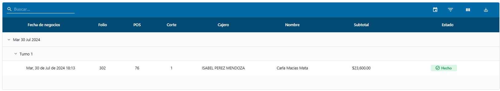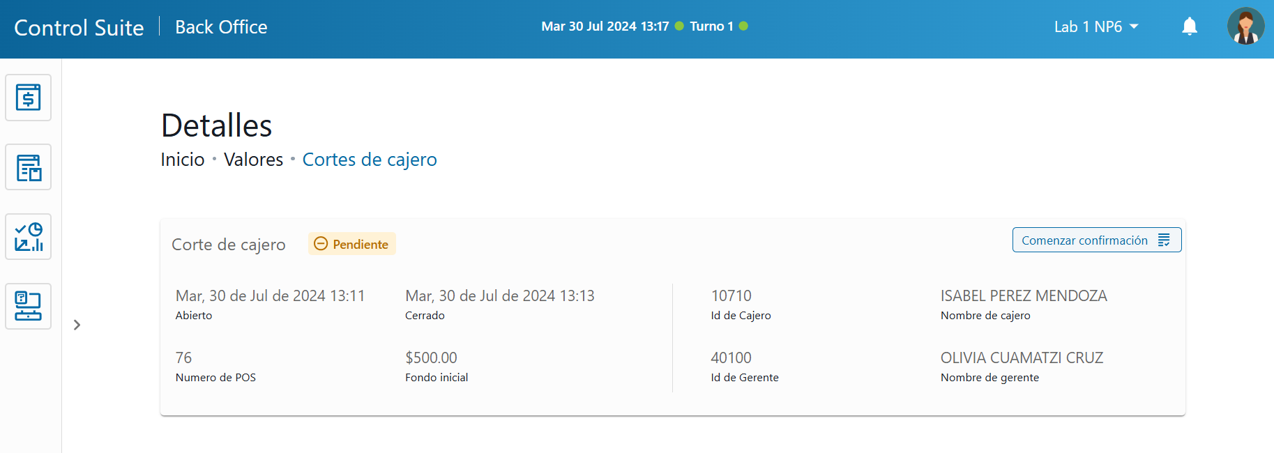 A diferencia de los demás submódulos de ControlSuite®, Cortes de Cajero no cuenta con un botón de "Nuevo". Los cortes que llegan desde la integración con POS con el estado "Pendiente" se confirman haciendo clic en el corte y luego en "Confirmar".