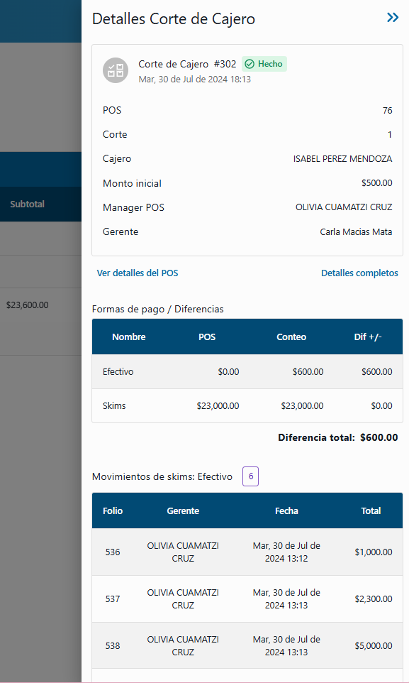 La tabla de movimiento muestra los cortes de cajero realizados durante el día actual de operación. Toda esta información se obtiene a través de la integración entre ControlSuite® y el sistema de punto de venta de la sucursal.