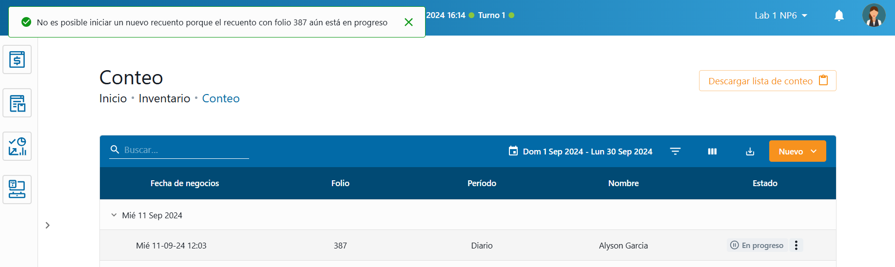 ⚠️ No es posible iniciar un conteo de inventario si hay otro en proceso, sera necesario cancelarlo.