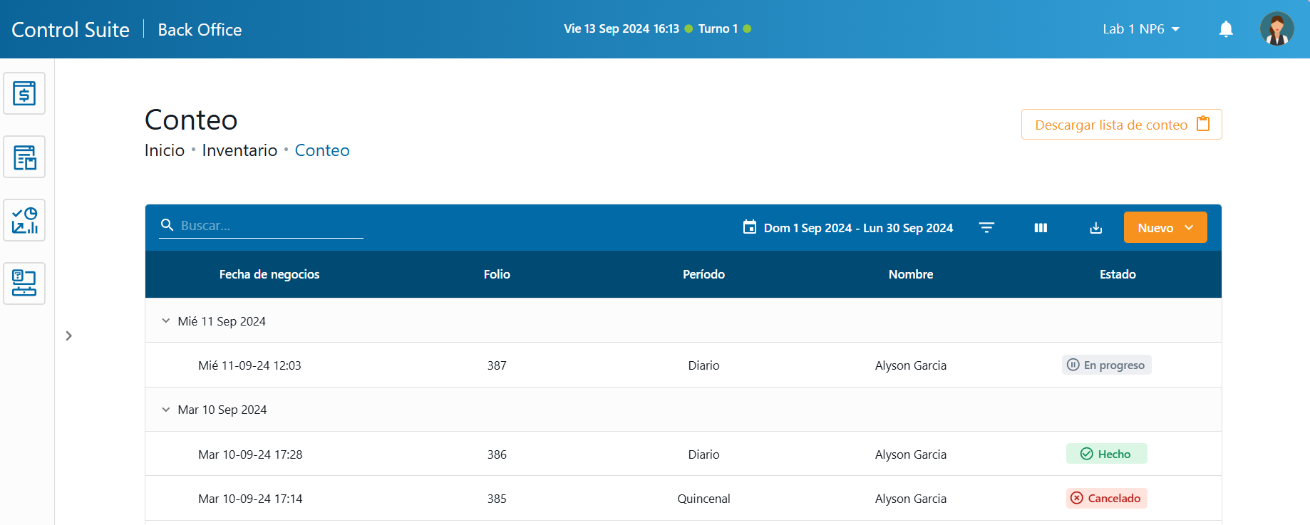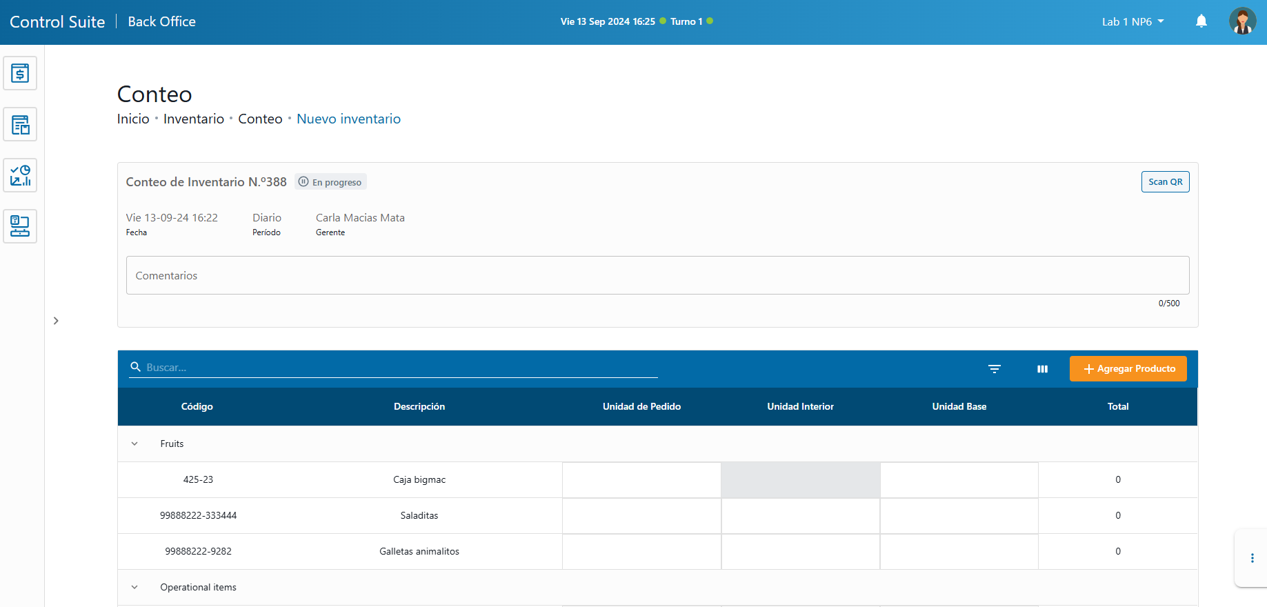 La captura de inventario en ControlSuite® permite registrar los productos o activos de la sucursal de manera eficiente. Sigue estos pasos para generar un conteo: