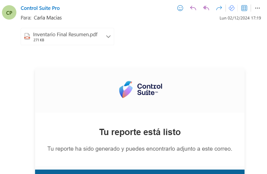 - Correo electrónico: El reporte será enviado al correo registrado en ControlSuite®.