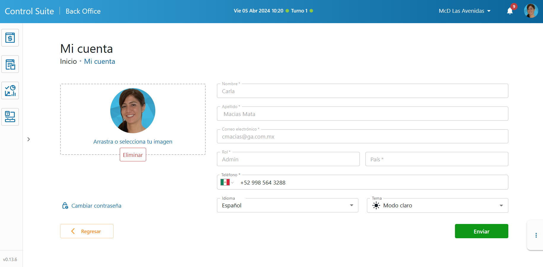 - Imagen de perfil: Muestra la imagen definida por el usuario y te permite actualizarla o eliminarla