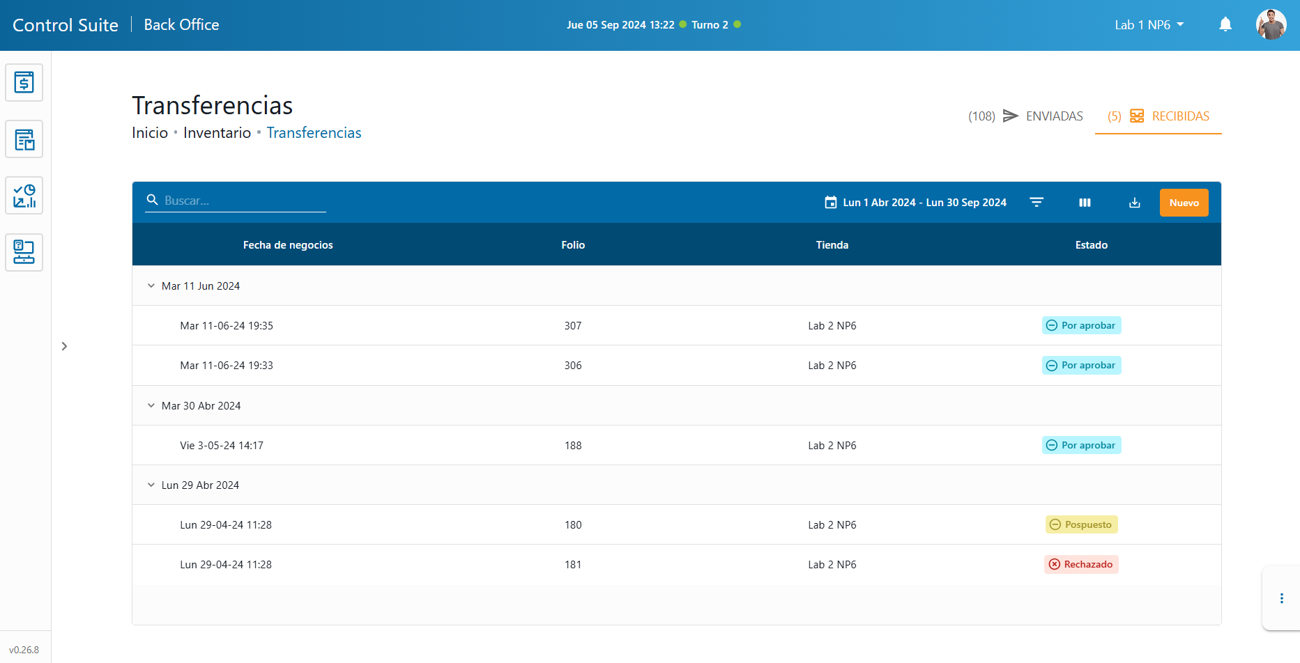 Al hacer clic en una notificación, serás redirigido automáticamente al submódulo correspondiente de Transferencias de Inventario, donde podrás visualizar y gestionar las solicitudes de Transferencias recibidas.