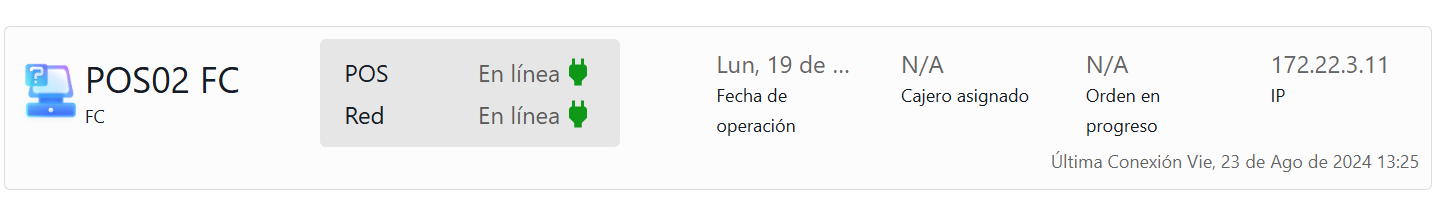 - Fecha de Operación: Muestra la última fecha en la que el punto de venta realizó una operación. Esta información es útil para verificar que todos los POS están operando dentro del horario esperado y para identificar posibles inactividades no planificadas.