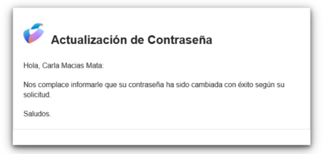 Finalmente, recibirás un correo electrónico confirmando que el restablecimiento de tu contraseña se realizó correctamente.
