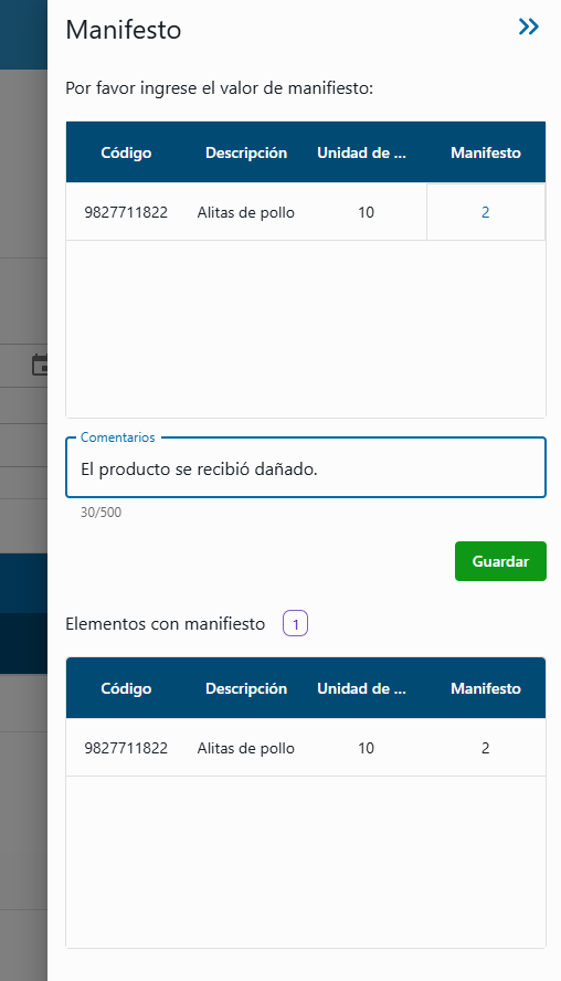 ⚠️ En caso de que haya algún problema con los productos recibidos, como una cantidad menor a la solicitada, productos en mal estado o expirados, es posible añadir un manifiesto para documentar estas incidencias.