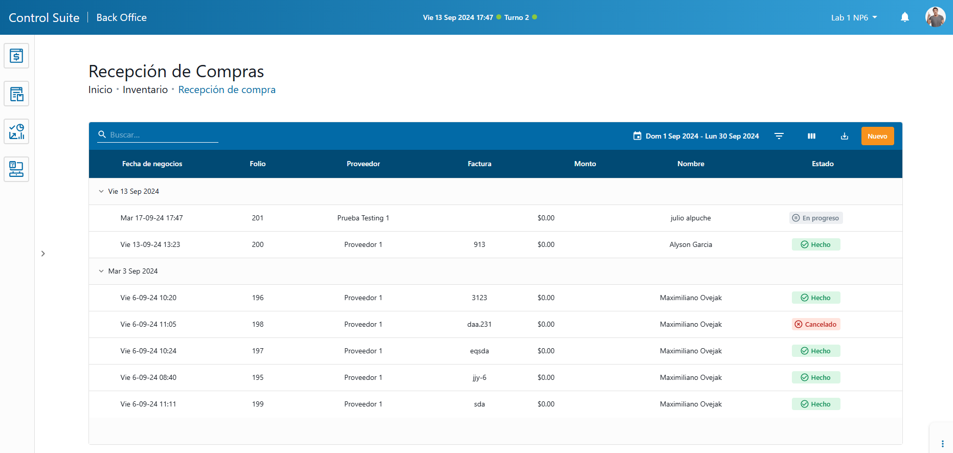 - En la pantalla de Recepción de compras, haz clic en el botón "Nuevo ".