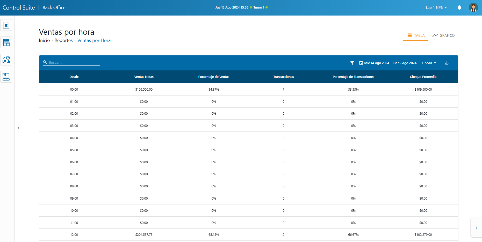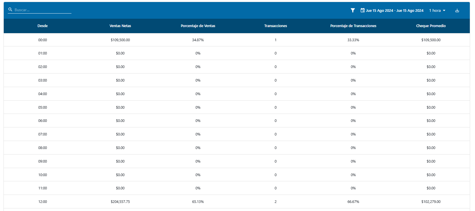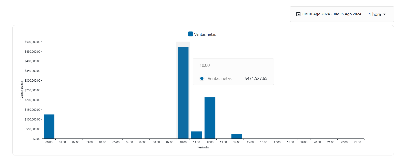 Por defecto, la gráfica del reporte de ventas por hora abarca el día actual de operación de la sucursal , con los datos segmentados por hora. Sin embargo, tanto el período como la segmentación de tiempo (1 hora, 30 minutos o 15 minutos) pueden ajustarse según las necesidades del usuario.