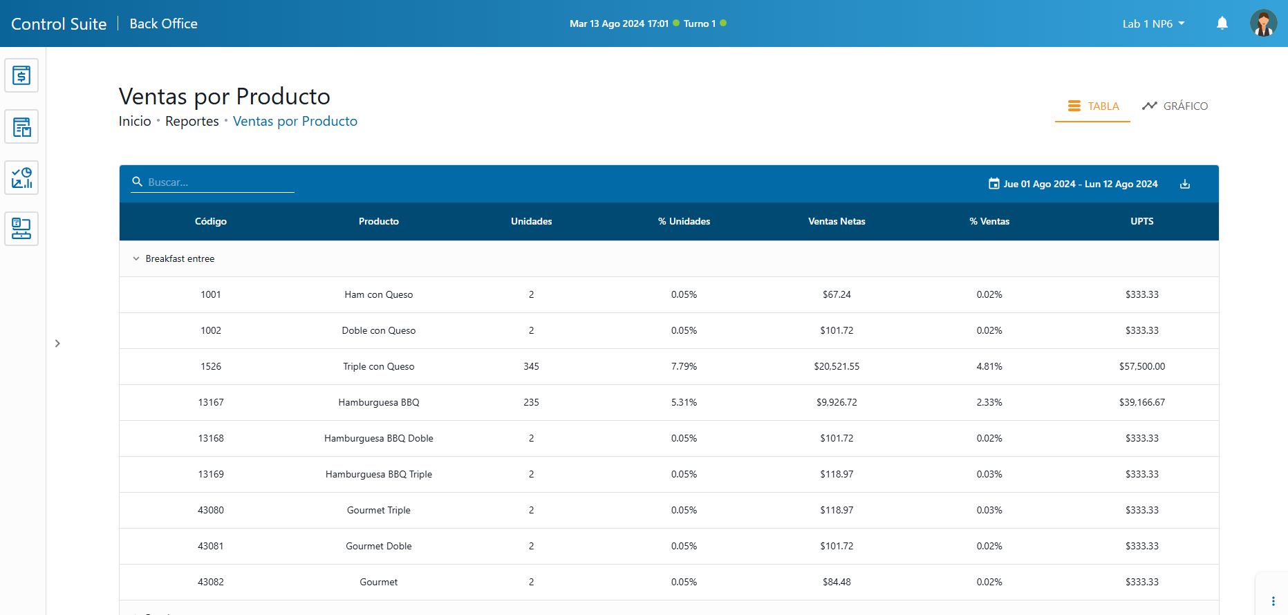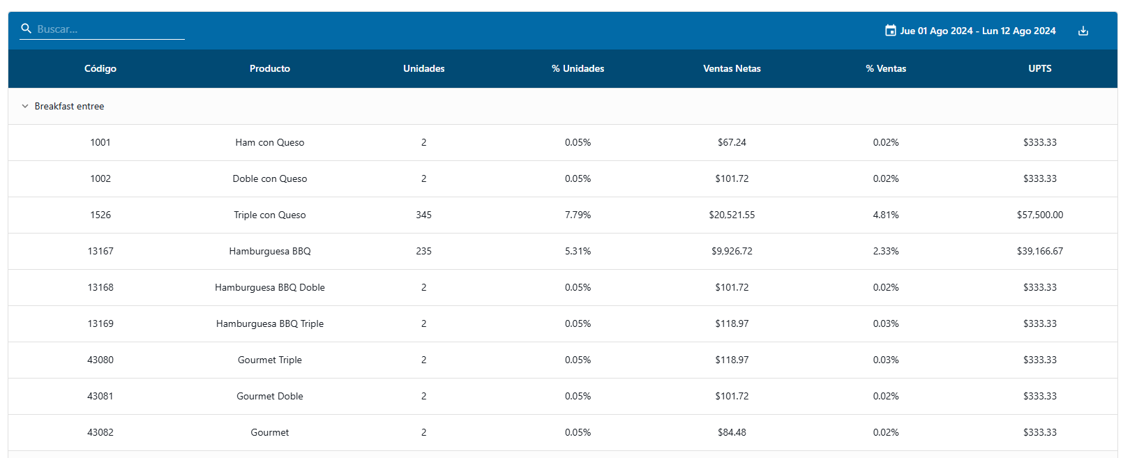 - Venta neta: Refleja el total de ventas del producto sin impuestos generadas por la sucursal durante el período.