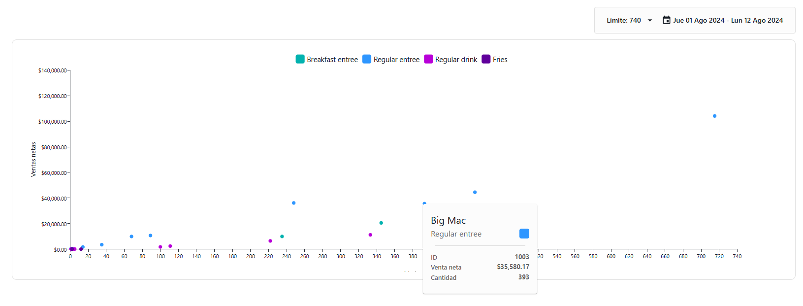 Gráfica de dispersión: permiten a los usuarios ver cada producto que es representado por un punto y trabaja con el mismo rango de fechas seleccionado anteriormente, también muestra el límite de productos mostrados en la gráfica el cual es modificable. El eje vertical (Y) representa el monto de ventas, mientras que el eje horizontal (X) muestra el cantidad o numero vendido.