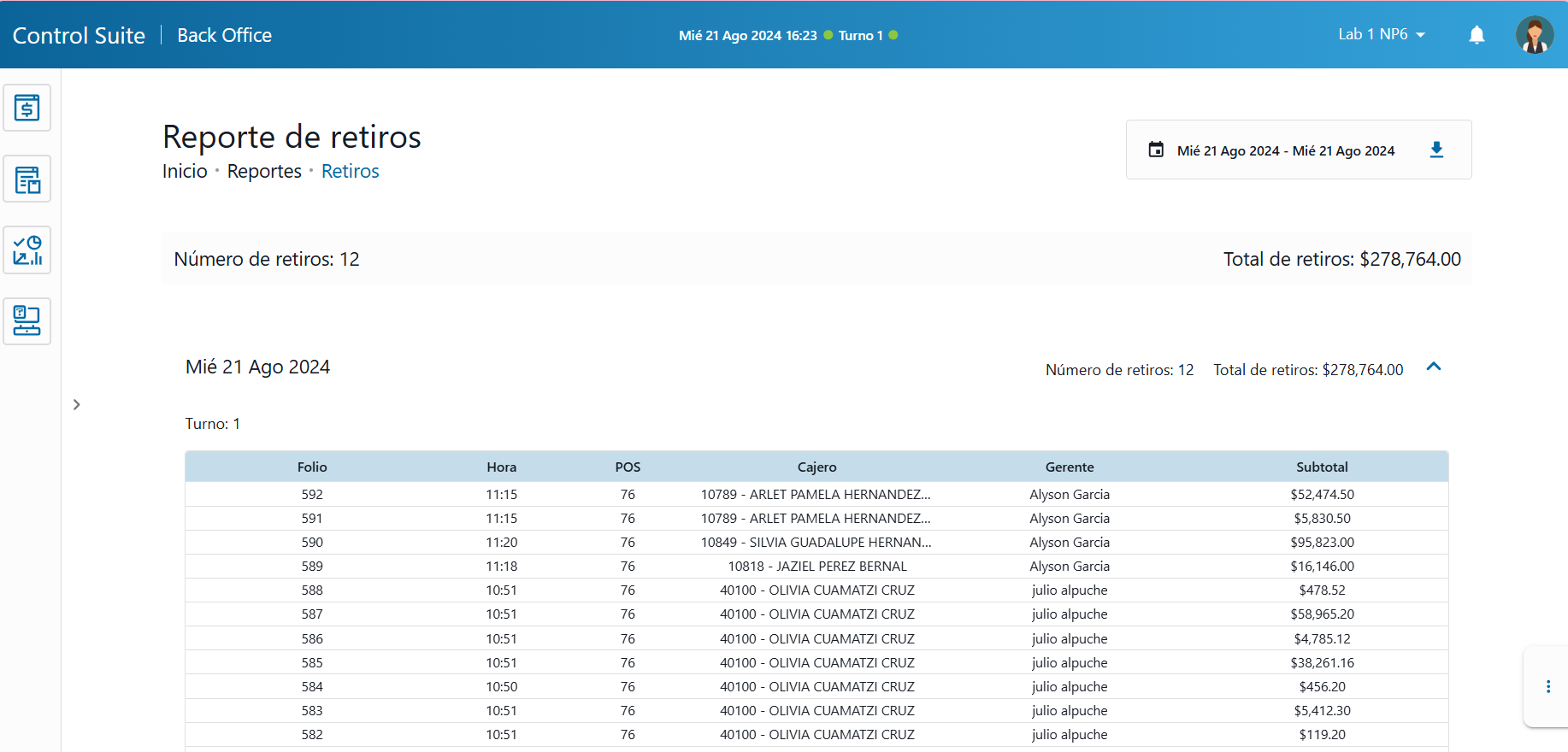 Nota: Los retiros que se visualizan en este reporte son solo aquellos que se han llegado a controlsuite mediante la integración con el POS en Valores > Submódulo retiros.