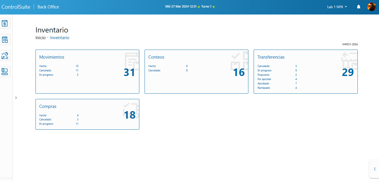 Movimientos de los submódulos: muestra la cantidad de movimientos realizados por cada submódulo de inventario y sus estados correspondientes.