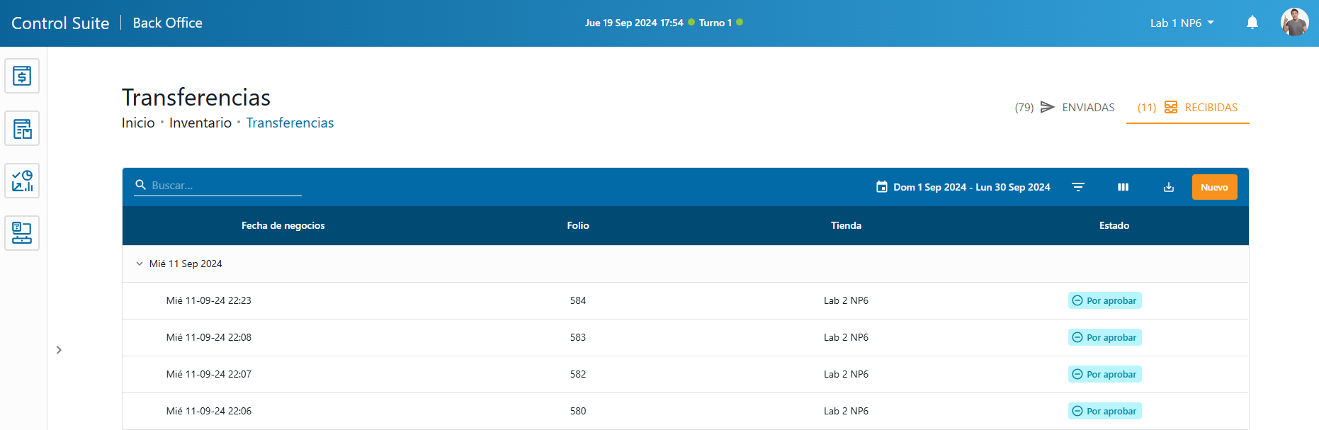 - En la tabla de movimientos de la pantalla principal, haz clic en el botón "RECIBIDAS" para visualizar las transferencias por aprobar.